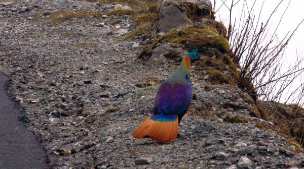 সকালে হাল্কা হয়ে, চা খেয়ে আমরা যে যার মতো তৈরি হয়ে রাস্তায় গাড়ির কাছে নেমে এলাম। কতক্ষণে রওনা দেবো এই ভাবনায় আর তর সইছে না –ওদিকে আবার বরফ পড়া বন্ধ হয়ে যাবে না তো! অবশেষে নিমাচেন থেকে বেরিয়ে সিল্ক-রুট বা রেশমপথে পদমচেন হয়ে পৌঁছলাম ৯৫০০ ফুটের জনপ্রিয় স্পট জুলুক। জুলুক পেরিয়ে “থাম্বি” ভিউ পয়েন্ট (১১,১০০ফুট) এলাম এ অঞ্চলের বিখ্যাত পাহাড়ি রাস্তার বাঁক দেখতে দেখতে। এখান থেকেই সবুজ পাহাড় হারিয়ে রুক্ষ পাহাড়ি খাড়াই পথের যাত্রা। মাঝেমাঝে পথের দুধারে শুকিয়ে যাওয়া ঘাস আর মাটিতে পড়া ছড়ানো বরফের ফাঁকে আলো করে ফুটে আছে নানা রঙের রডোডেনড্রন। থাম্বিতে সকলেই কিছুক্ষণ সময় কাটায় এখান থেকে মাউন্ট কাঞ্চনজংঘাকে সুন্দর দেখা যায় বলে। আমাদের কপাল খারাপ – অত্যধিক মেঘ-কুয়াশার কারণে তিনি দেখা দিলেন না। তবে এ পাহাড়ের সুবিখ্যাত পাখি “মোনাল”-এর দেখা পাওয়ার সৌভাগ্য হয়েছিল এখানেই।