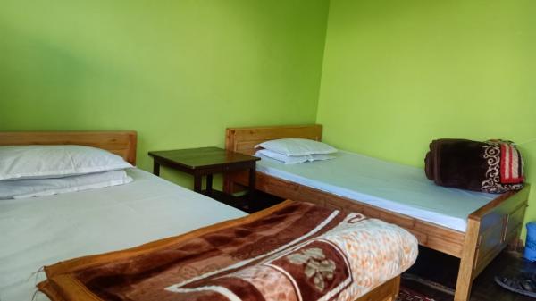 অবশেষে আমাদের গন্তব্যে পৌঁছলাম মাউন্টেন ভিউ হোম স্টে. গাড়ি থেকে নামতেই উষ্ণ অভ্যর্থনা জানালেন জামির মালিক৷ মিষ্টি এবং সরবত দিয়ে হল অতিথি আপ্যায়ন৷ সাধারণ হোমস্টে৷ বিলাসবহুল না হলেও তাতে যত্নের বা আতিথেয়তার উষ্ণতার এতটুকু অভাব নেই৷ মুখে হাসিটি লেগেই আছে৷ আমাদের ঘর পেয়ে গেলাম৷ ছেলেরা এবং মেয়েরা ঘর ভাগ বাটোয়ারা করে নিলাম৷ বেলা প্রায় বারোটা বাজে৷ একে একে আটজনের স্নান সেরে নিতে বেশ বেলা হয়ে গেল৷ জামির জী জানিয়ে গেলেন দ্বিপ্রাহরিক আহার প্রস্তুত৷ বারান্দায় এসে দাঁড়াতেই সবার মন ভরে গেল৷ শ্বেতশুভ্র পাহাড় দূরে দাঁড়িয়ে যেন হাত নাড়ছে আর বলছে, এসো বন্ধু৷ খাবার ঘরে পৌঁছেই দেখি টেবিলে সাজানো ধোঁয়া ওঠা ভাত, ডাল, উচ্ছে-আলু ভাজা, তরকারি আর ডিমের কারি৷ পরম তৃপ্তিতে সারা হল ভোজন৷