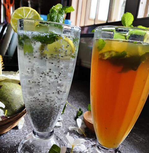 এক। কিছুটা মিছ্রি জলে ভিজিয়ে রাখতে হবে। ফ্রিজে রাখাই ভালো নয়তো পিঁপড়ের আক্রমণ হতে পারে। এক চামচ সবজা বা বেসিল সিড ভিজিয়ে রাখতে হবে। দু মিনিট। মিছরি জলে গুলে গেলে পরিমাণ মতো গ্লাসে ছেঁকে নিয়ে তার মধ্যে লেবুর রস, একটু পুদিনা পাতা থেঁতো, বিট নুন, সবজা, সামান্য সোডা ওয়াটার আর আর আরেকটু মজার বানাতে একটা কাঁচালঙ্কা সামান্য চিরে নিয়ে কাঁচের গ্লাসে। দু টুকরো বরফ,একটা পেপার স্ট্র দিয়ে তাড়িয়ে তাড়িয়ে উপভোগ করুন।